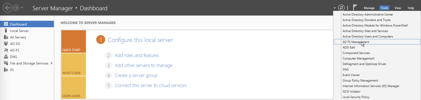 1. Open the AD FS management console by going to the Server Manager console and selecting AD FS Management from the Tools list (on the right).