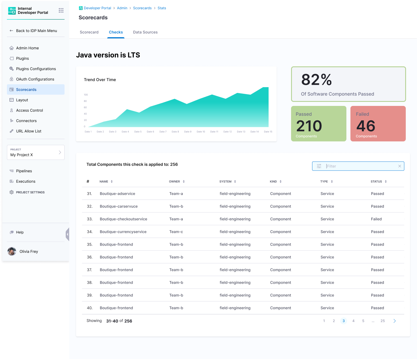 The overview page lists all the components on which the check is applied, and the graph helps you to track time-sensitive information on the components on which the check has passed, this can be used to track functions like migration and upgrades across your software ecosystem.