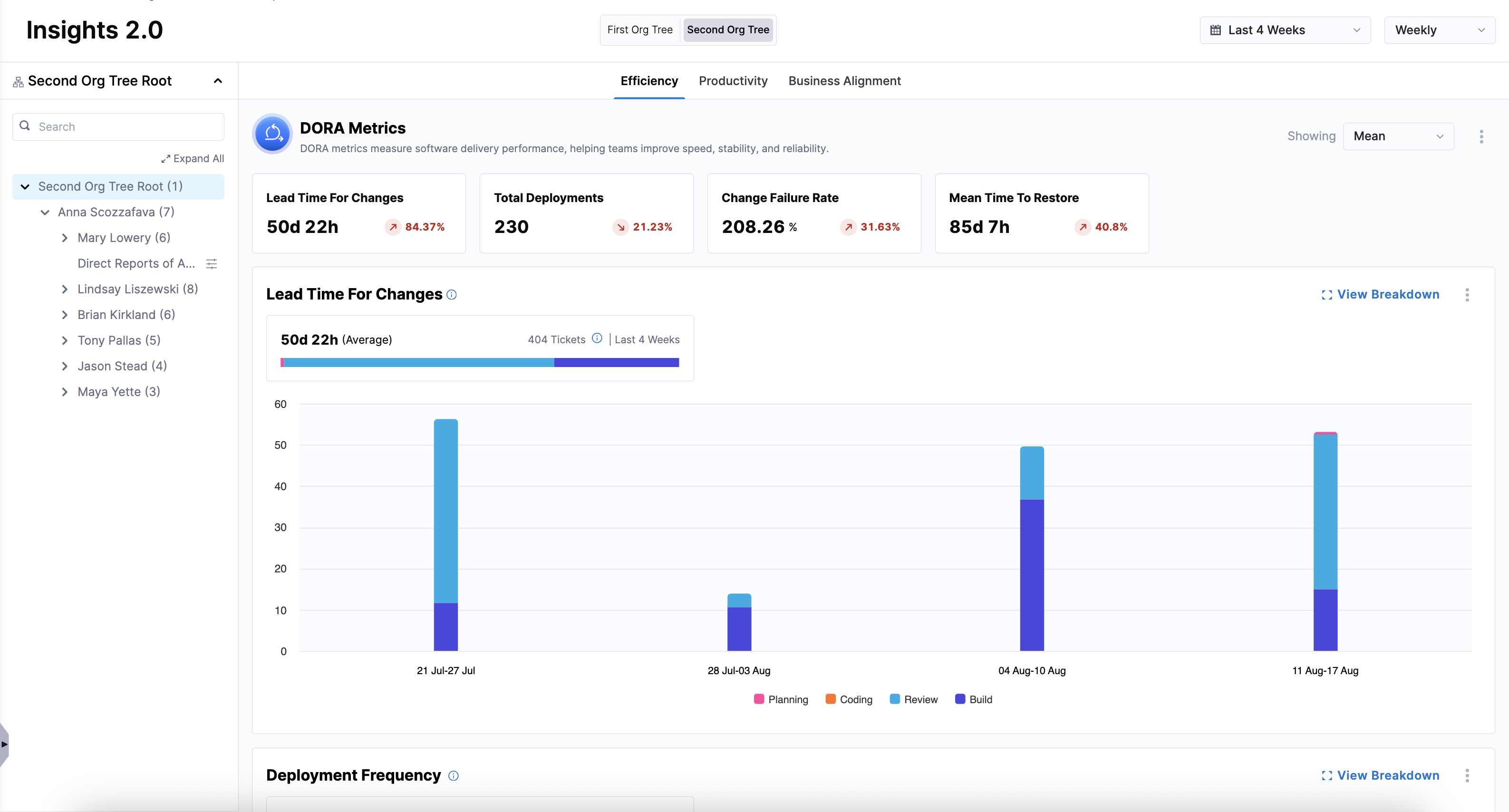 If your organization uses multiple Org Trees, you can switch between them to view insights by selecting a different Org Tree above the Efficiency, Productivity, and Business Alignment tabs.